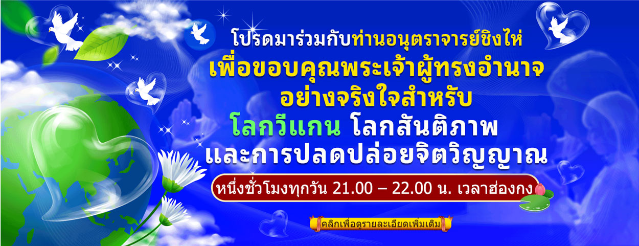 เดินบนวิถีของความรักความรักไม่ใช่เพียงคำพูดจากปากเรา ความรักต้องเป็นความรู้สึกภายใน และแปลเป็นการกระทำออกมาภายนอก รักสัตว์ทั้งหลาย เราเป็นเวจ (วีแกน) รักโลก เรารักษ์สิ่งแวดล้อม รักโลก กอบกู้ดาวเคราะห์ - อนุตราจารย์ชิงไห่ (วีแกน)รับชมเพิ่มเติมเดินบนวิถีของนักบุญที่ยังมีชีวิตอยู่เกี่ยวกับท่านอนุตราจารย์ชิงไห่ศิลปะและจิตวิญญาณเกี่ยวกับท่านอนุตราจารย์ชิงไห่“รักแท้” - ดนตรีที่รวมหัวใจเป็นหนึ่งเดียวเกี่ยวกับท่านอนุตราจารย์ชิงไห่หนังสือเพิ่มเติมบทกวีWu Tzu PoemsWu Tzu Poemsอ่านเพิ่มเติมบทกวีThe Love of CenturiesThe Love of Centuriesอ่านเพิ่มเติมบทกวีThe Dream of a ButterflyThe Dream of a Butterflyอ่านเพิ่มเติมบทกวีSilent TearsSilent Tearsอ่านเพิ่มเติมจิตวิญญาณSecrets to Effortless Spiritual PracticeAs I recall,there was no secret behind my attainment of the Truth.All I had then was pure sincerity.I pursued spiritual practice without any ideas, demands or person in my mind. I was naturally like that. Even if you asked me to die for the Truth at that time, I would have done it as I wasn't attached to anything in the world. Whether I had food or not I persisted in my spiritual practice. I never complained, nor was I distracted from the Truth by food.อ่านเพิ่มเติมจิตวิญญาณI Have Come to Take You HomeI Have Come to Take You Homeอ่านเพิ่มเติมจิตวิญญาณColoring Our LivesColoring Our Livesอ่านเพิ่มเติมจิตวิญญาณAphorisms 2Aphorisms 2อ่านเพิ่มเติมจิตวิญญาณAphorisms 1Aphorismsอ่านเพิ่มเติมศิลปะThe Real LoveThe Real Loveอ่านเพิ่มเติมศิลปะLoving the Silent Tears 3Loving the Silent Tears 3อ่านเพิ่มเติมศิลปะLoving the Silent Tears 2Loving the Silent Tears 2อ่านเพิ่มเติมศิลปะLoving the Silent Tears 1Loving the Silent Tears 1อ่านเพิ่มเติมศิลปะCelestial ArtCelestial Artอ่านเพิ่มเติมการปรุงอาหารSupreme Kitchen 2Supreme Kitchen2อ่านเพิ่มเติมการปรุงอาหารSupreme Kitchen 1Supreme-Kitchen1อ่านเพิ่มเติมสภาพอากาศเปลี่ยนแปลงFrom Crisis to PeaceAt conferences, in interviews with journalists and at gatherings with disciples in recent years, Supreme Master Ching Hai has spoken with increasing urgency about Earth’s current climate crisis. As she states, “Our planet is a house that is burning. If we don’t work together with a united spirit to putout the fire, we will not have a home anymore”, But she also offers humankind an uplifting solution, one that every individual can easily achieve: ”Be veg to save the planet.”อ่านเพิ่มเติมสัตว์ที่สูงส่งThe Noble WildsThe Noble Wildsอ่านเพิ่มเติมสัตว์ที่สูงส่งThe Dogs in My LifeThe Dogs in My Lifeอ่านเพิ่มเติมสัตว์ที่สูงส่งThe Birds in My LifeThe Birds in My Lifeอ่านเพิ่มเติมเด็ก ๆYour Halo is too Tight!Your Halo is too Tight!อ่านเพิ่มเติมเด็ก ๆMaster Tells StoriesMaster Tells Storiesอ่านเพิ่มเติมเด็ก ๆGod Takes Care of EverythingGod Takes Care of Everythingอ่านเพิ่มเติมอื่น ๆThe Realization of HealthThe Realization of Healthอ่านเพิ่มเติมบทกวีจิตวิญญาณศิลปะการปรุงอาหารสภาพอากาศเปลี่ยนแปลงสัตว์ที่สูงส่งเด็ก ๆอื่น ๆนิตยสารเพิ่มเติมนิตยสารNews Magazine No.215ในโลกนี้มันง่ายกว่าที่จะบำเพ็ญและทำให้ดีขึ้น เพราะว่ามี ผู้คนที่ทุกข์ทรมานมีสถานการณ์ที่ทุกข์ทรมานมีสถานการณ์ที่ไม่สมบูรณ์ที่จะมีผลต่อความเมตตาของเราซึ่งจะปลุกหัวใจที่เมตตาของเราและแล้วเราจะสามารถนำมันออกมาทำให้มันดีขึ้นทำให้สถานการณ์ดีขึ้น ช่วยเหลือคนอื่นนั่นคือวิธีที่สร้างสวรรค์นั่นคือทำไมเราพูดว่าสวรรค์อยู่บนโลกอ่านเพิ่มเติมนิตยสารNews Magazine No.214